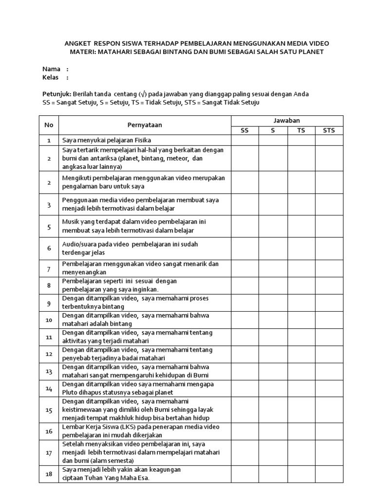 Angket respon kelompok kecil siswa ANGKET RESPON SISWA TANGGAPAN SISWA TERHADAP PENGEMBANGAN MEDIA PEMBELAJARAN KOMIK KONTEKSTUAL PADA MATERI VIRUS Nama. Berdasarkan hasil penelitian Sartika 2015 respon siswa diperoleh setelah pembelajaran respon. Delapan soal untuk pernyataan positif dan empat soal untuk pernyataan negatif.