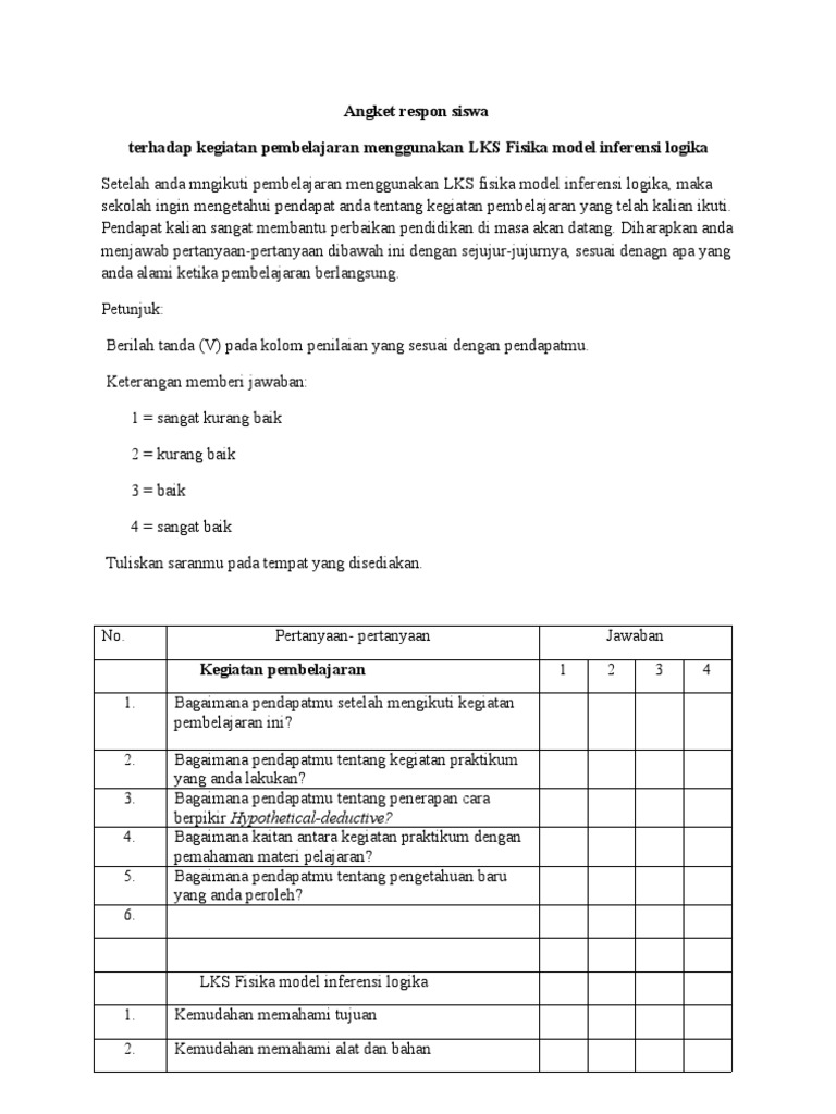 Angket Respon Siswa Terhadap Kegiatan Pembelajaran Menggunakan Lks Fisika Model Inferensi Logika