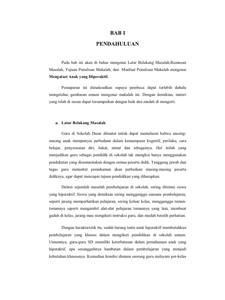 Tujuan penelitian ini untuk mendeskripsikan perilaku siswa hiperaktif berbagai metode yang diberikan GPK dan upaya mengatasi perilaku hiperaktif siswa kelas III di MIM PK Kartasura. Perilaku yang digambarkan di atas merupakan sedikit contoh dari perilaku anak hiperaktif. Gunakan otoritas Anda sebagai guru untuk menjadikan mereka teman satu bangku.