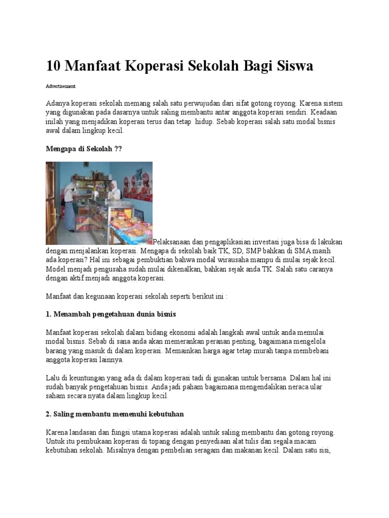 Adalah Sekretaris Menteri Koperasi dan Usaha Kecil dan Menengah Menkop UKM Meliadi Sembiring pada Jumat 16112018 yang mengisyaratkan bahwa pentingnya sosialisasi dan edukasi lebih banyak mengenai koperasi kepada siswa SMA khususnya mesti menjadi perhatian. Dewan penasihat terdiri atas kepala sekolah guru perwakilan orang tua siswa. Koperasi siswa adalah koperasi yang berada dalam lingkungan sekolah yang anggotanya merupakan siswa dari sekolah tersebut yang dapat melakukan kegiatan ekonomi tanpa badan hukum.